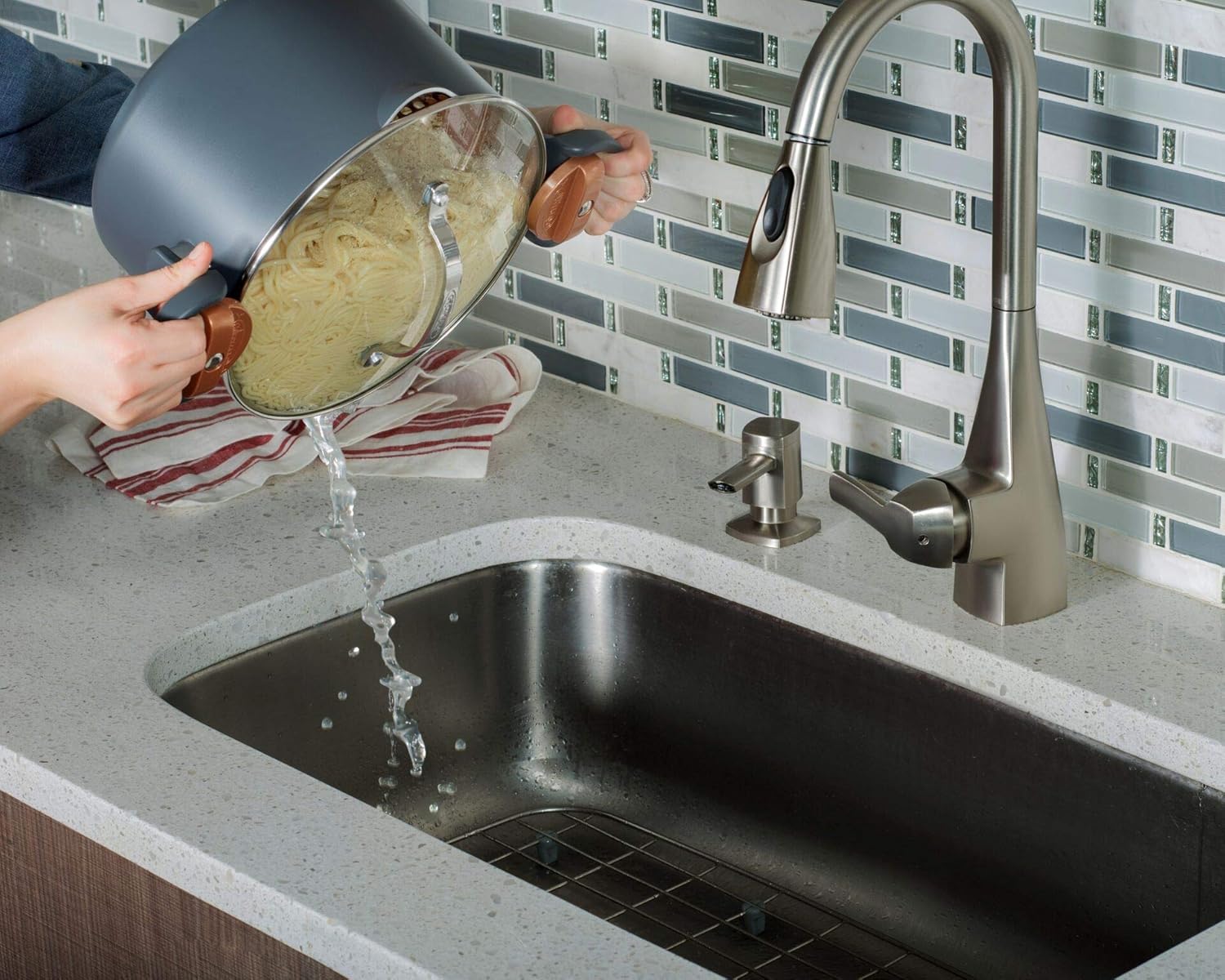 Introducing the Gotham Steel 5 Quart Stock Pot, the ultimate multipurpose pasta pot that will revolutionize your cooking experience. This pot features a convenient strainer lid, making it easy to drain pasta or veggies without the hassle of using a separate colander. The twist and lock handles provide a secure grip, while the nonstick ceramic surface ensures effortless food release and easy cleanup.